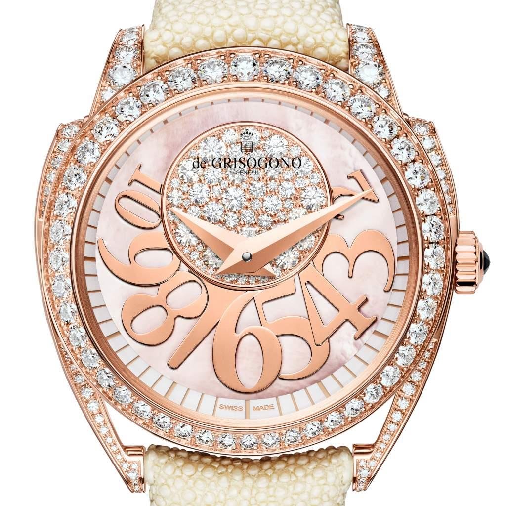 In this model , the dial and its bevelled inner bezel ring appear for the first time clothed in mother-of-pearl. Asymmetry also finds its way into its subtly graduated bezel gemsetting of imposing diamonds – with a single row of 116 diamonds totalling 3.10 carats. The stylised Arabic numerals generously deploy their unusual shapes in a fascinating dance of time. The offset 12 o’clock subdial shines with the radiance of snowsetting – boldly flaunting 74 generous brilliant-cut diamonds and delicately framed by a gold ring.