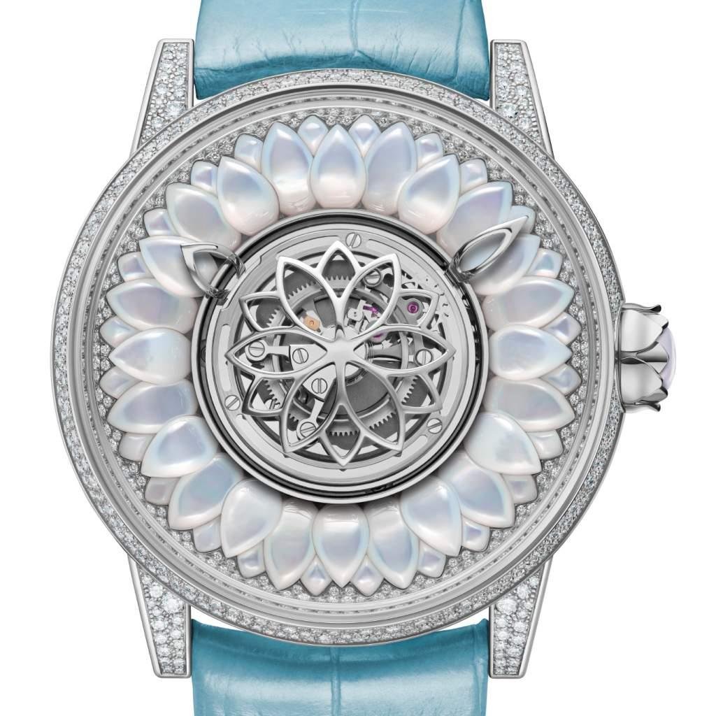 Offering 65 hours of power reserve, the self-winding movement is equipped with two barrels and a bi-directional, ball-bearing-mounted rotor. A highly refined arrangement of open-worked bridges and a hand-polished rotor segment echo the floral richness of the watch face. Under the domed sapphire crystal, the tourbillon cage is formed from hand-polished gold petals that echo the shape of the gemstone petals on the outer dial, as well as the open-worked hour and minute hands.