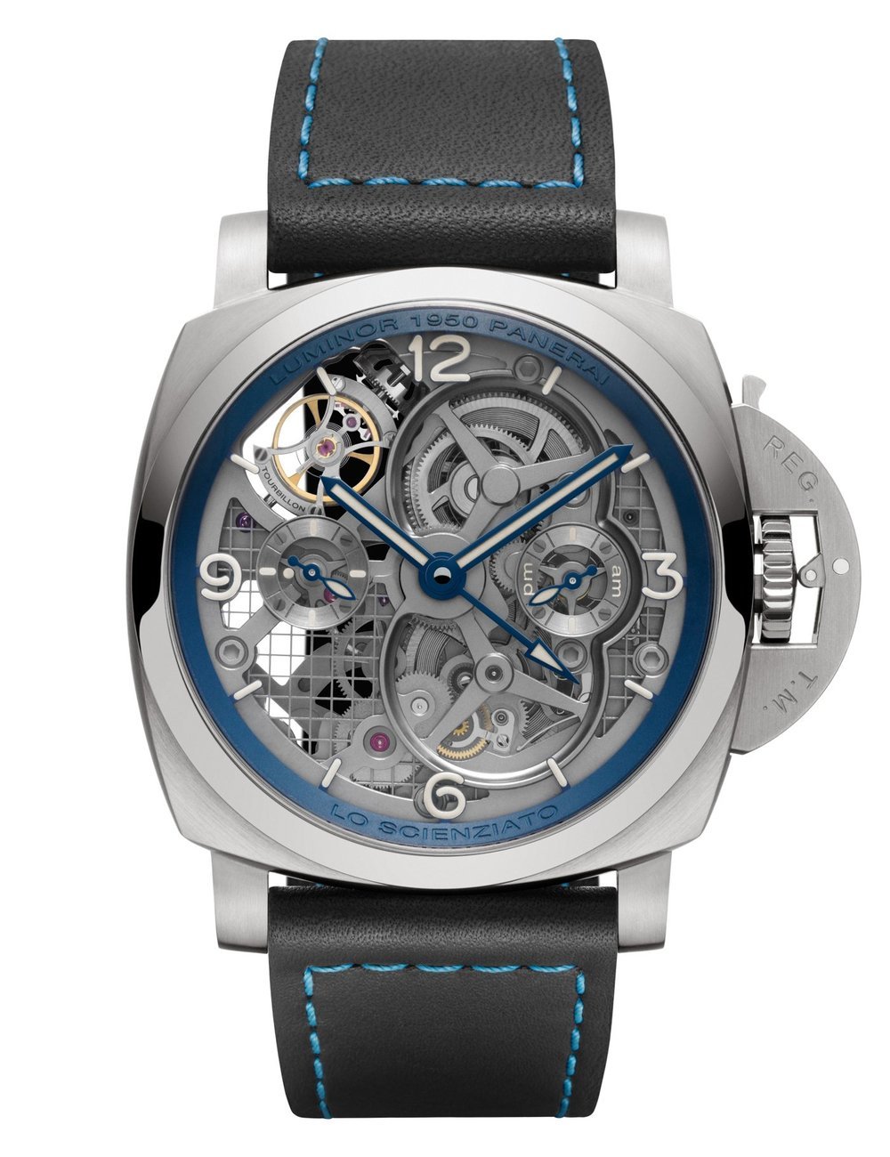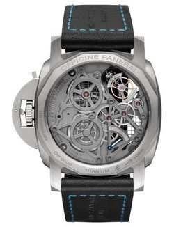 Skeleton hand-wound mechanical, P.2005/T calibre, executed entirely by Panerai, 16¼ lignes, 10.05 mm thick, 31 jewels, Glucydur® balance, 28,800 alternations/hour. Incabloc® anti-shock device. Power reserve 6 days, three barrels. 277 components.