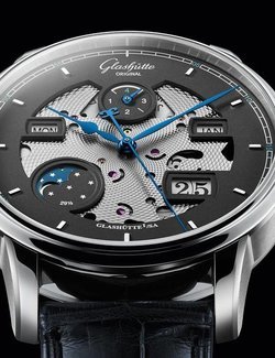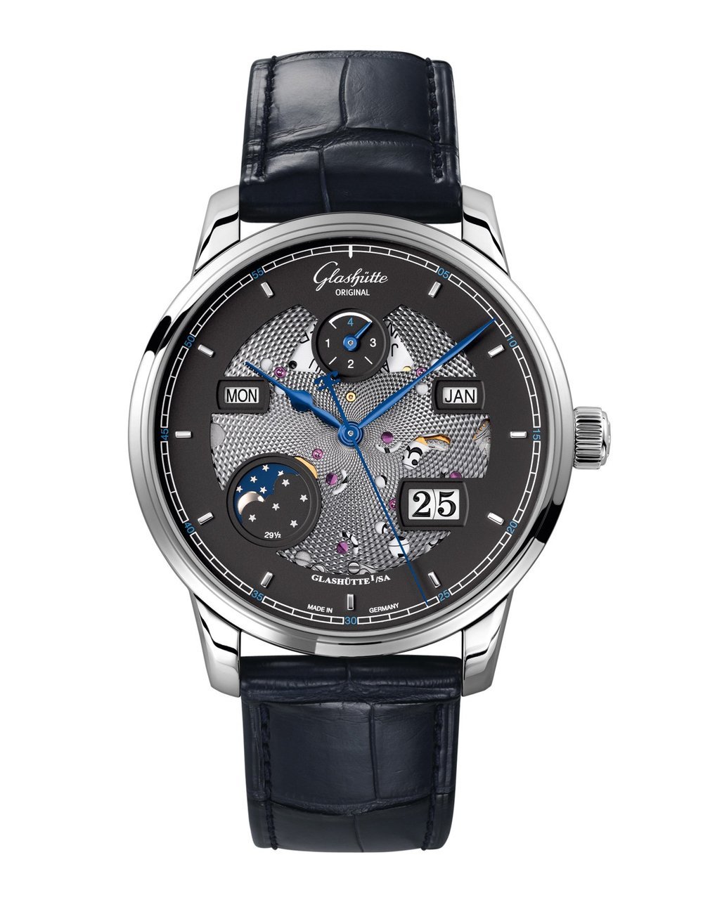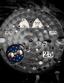 second second stop Perpetual Calendar with week day, Panorama Date, month, leap year and moon phase hour and minute (central)