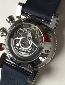Automatic chronograph movement HAN3809 (bicompax), 28,800 vibrations per hour, 4 Hz, 28 jewels, rotor with a skeletonised, incised Hanhart logo, power reserve of min. 42 hours