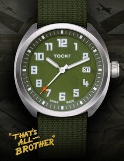 Although every D-Day C-47 is assembled in Switzerland, the design produced for Tockr by Emmanuel Gueit is decidedly American. Made in batches of 100, each numbered piece contains a unique portion of That’s All Brother as the base for its dial, preserved under sapphire crystal.