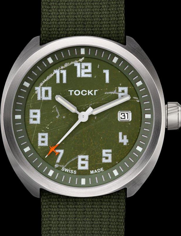 The unique dials bear evidence of their history with distinctive weathering, each a fragment of a much larger story that the CAF has preserved in the restored C-47 aircraft. The Tockr D-Day C-47 comes in three dial styles, each ranging from dark to light military hues of brown and green, but differentiated by varying degrees of original weathering, chipping, and scratches and distinctive markings. “Clean Cut,” offers the lightest degree of weathering, while “Stamped,” features medium weathering, with some original type in yellow, brown or blue hues. A third “Hard Worn” variation is heavily weathered, crackled, and chipped with large areas of exposed aluminum.