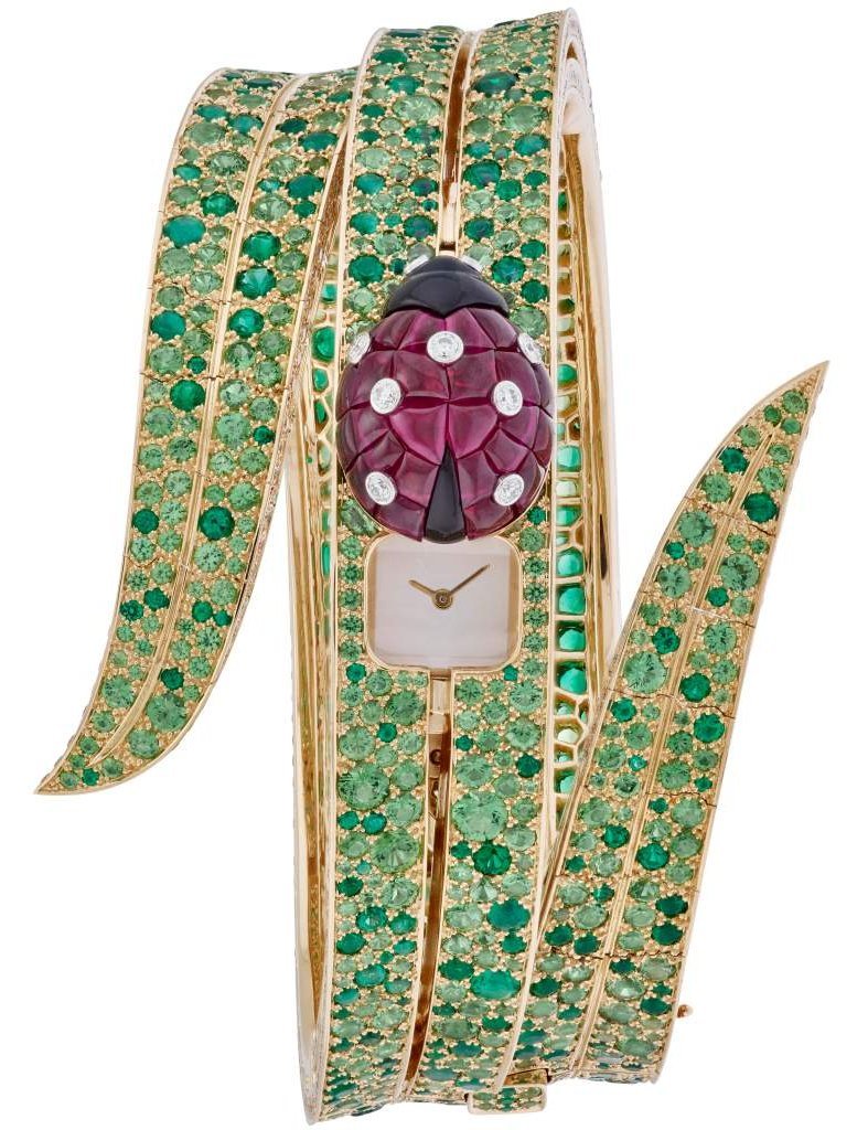 Yellow gold case. Ladybird in pink gold set with buff-topped Traditional Mystery Set™ rubies, white gold set with diamonds, onyx. Manual-winding mechanical movement (JLC 101). Bracelet in yellow gold set with round emeralds and round tsavorite garnets, clasp in yellow gold. Unique piece.