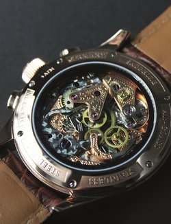 Hand winding chronograph cal. 3133.AS, completely hand engraved and refined; 23 rubies, fire-blued screws; power reserve of 42 hours with stop function off.