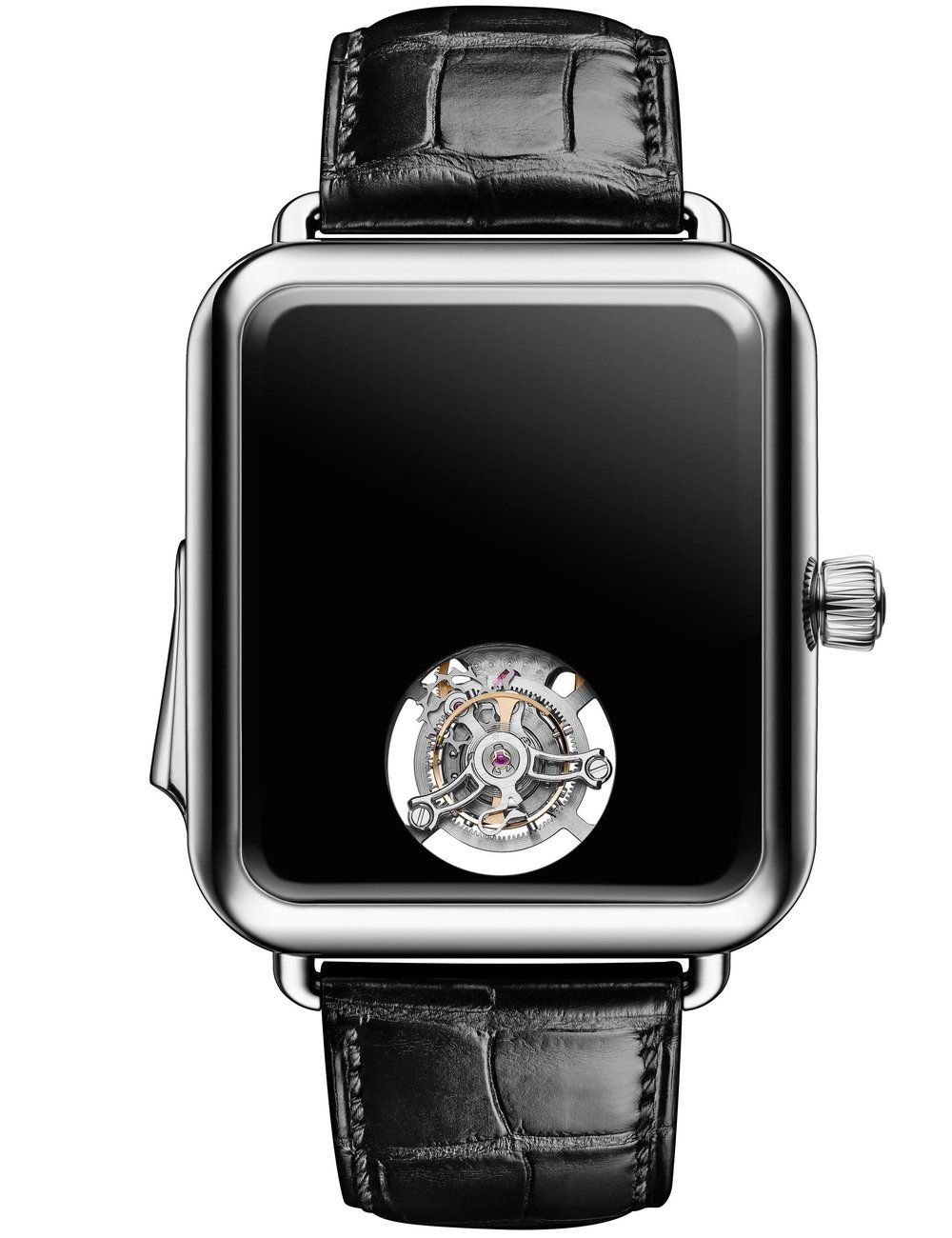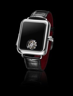 H. Moser & Cie. has made elegance its watchword and minimalism its signature. And, with the Swiss Alp Watch Concept Black, it is going even further. After removing both logo and indices from the dial of its Concept models, it now presents a watch with no hands which gives the time without displaying it. The glossy black dial features a one-minute flying tourbillon at 6 o’clock. And nothing else. To find out the time, you need to use your ears.