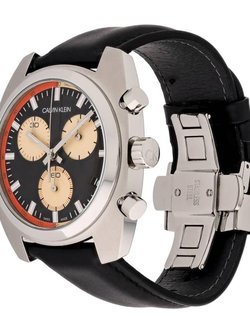 case measures 43 x 49.75mm. This quartz chronograph, water resistant