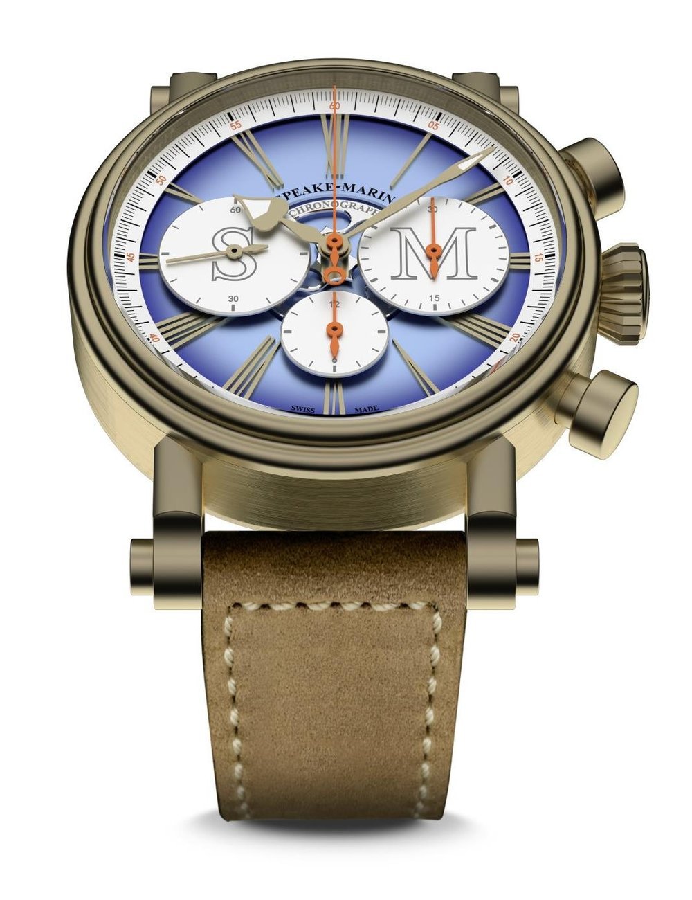 Minutes and seconds indications. 30-minute counter at 3 o’clock Real time 60-second counter at 9 o’clock. 2-hour counter at 6 o’clock. Central orange chronograph seconds hand.