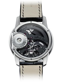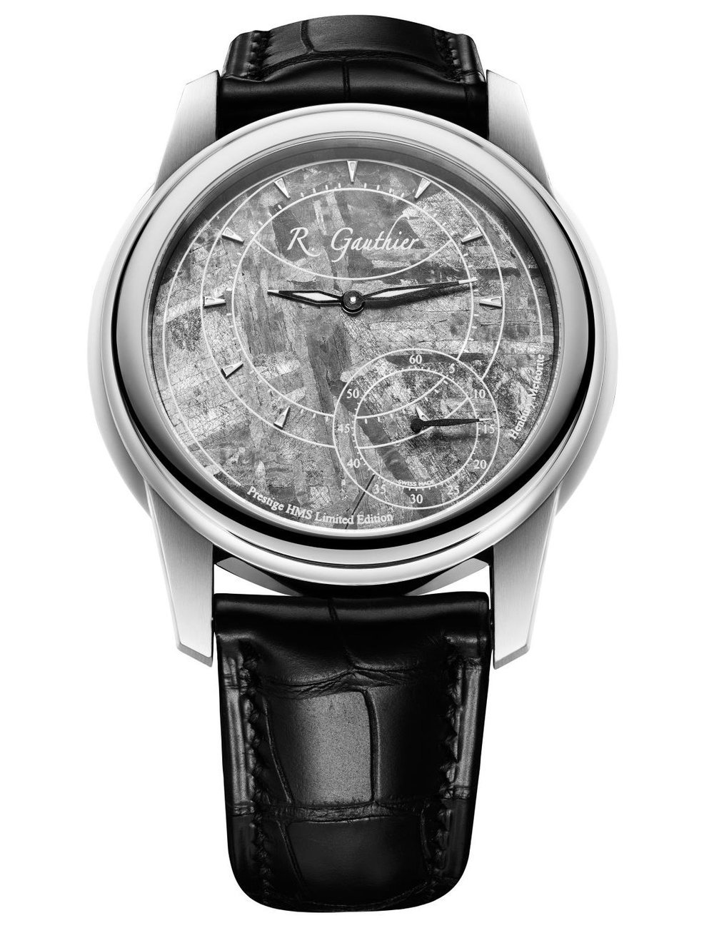 Prestige HMS Stainless Steel – Romain Gauthier’s first series watch in this material – features a stunning dial crafted from ultra rare Henbury meteorite boasting exceptionally coarse intersecting bands of nickel-iron crystal that spectacularly shimmer as the wearer turns the watch.