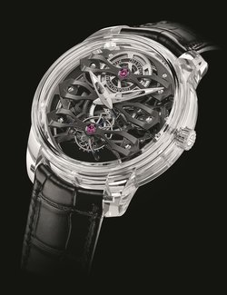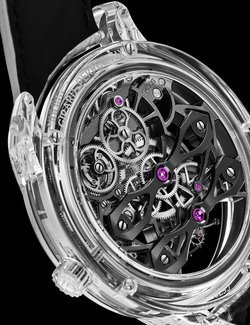 The 45 mm diameter Quasar case is entirely made of sapphire crystal. A chimney-style glass covers the movement bridges like a telluric dome. Its all-of-a-piece baseband features curving sides and angular lugs.