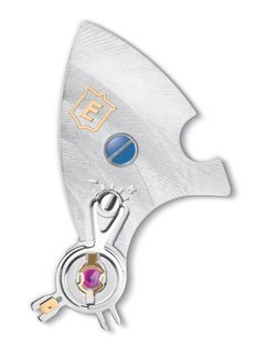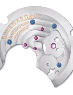 Meticulous attention has been paid to even the smallest of details, including of course, aesthetics, in order to maintain a harmonious balance that emphasizes geometric shapes. In particular, both balance wheel and gear train bridges feature vagues circulaires finishing, with fasteners in azuré and engravings in gold.