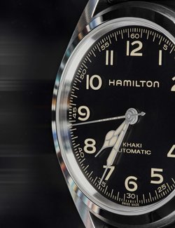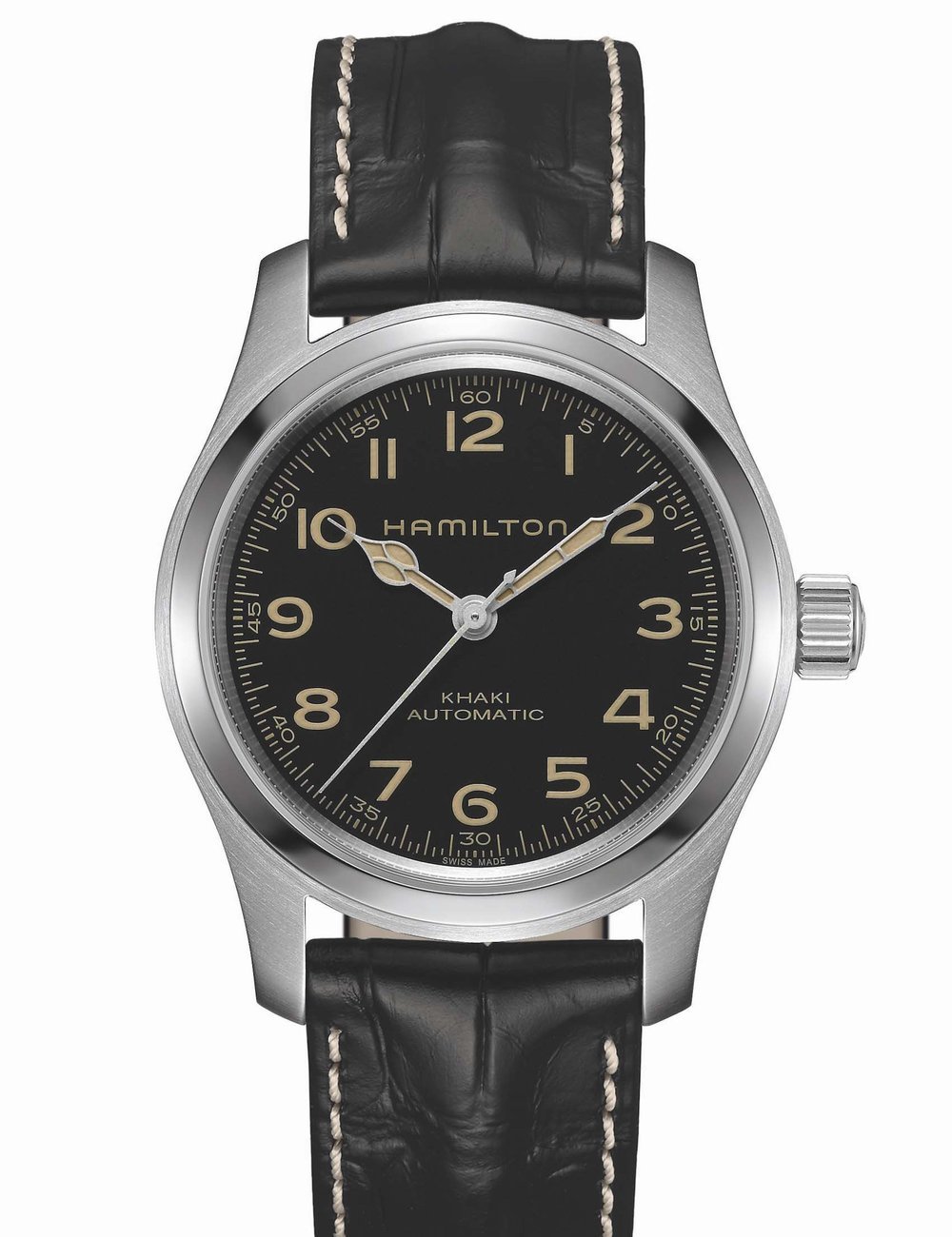 With its 42 mm stainless steel case, black dial, beige Super-LumiNova® inlaid hands, H-10 automatic movement with 80-hour power reserve and black leather strap, the Khaki Field Murph is an exact reproduction of the movie watch.