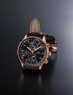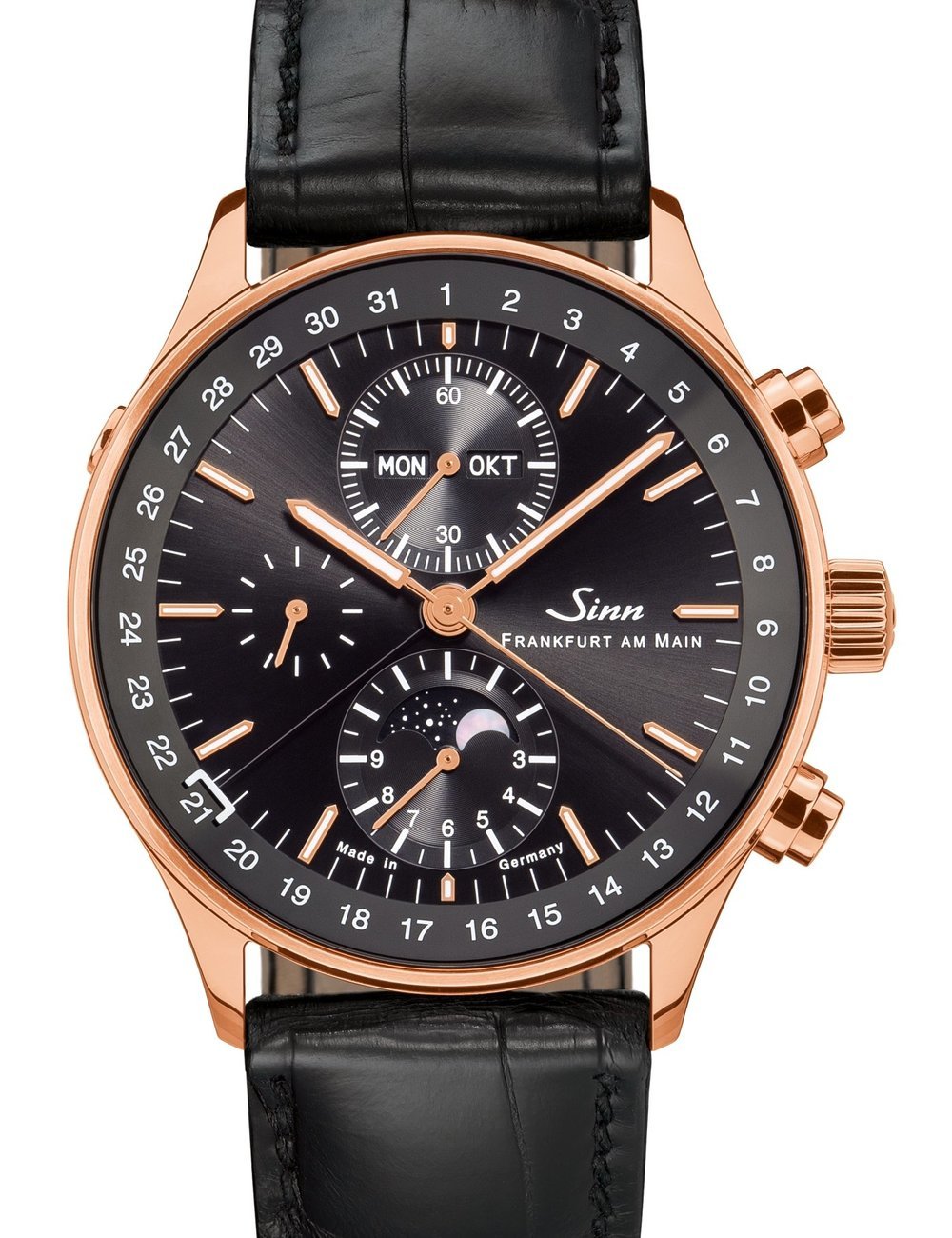 Hours, minutes, subsidiary seconds. Chronograph with 60-minute stopwatch display. Centre-mounted date hand. Day of the week display. Month Display. Moon phase display