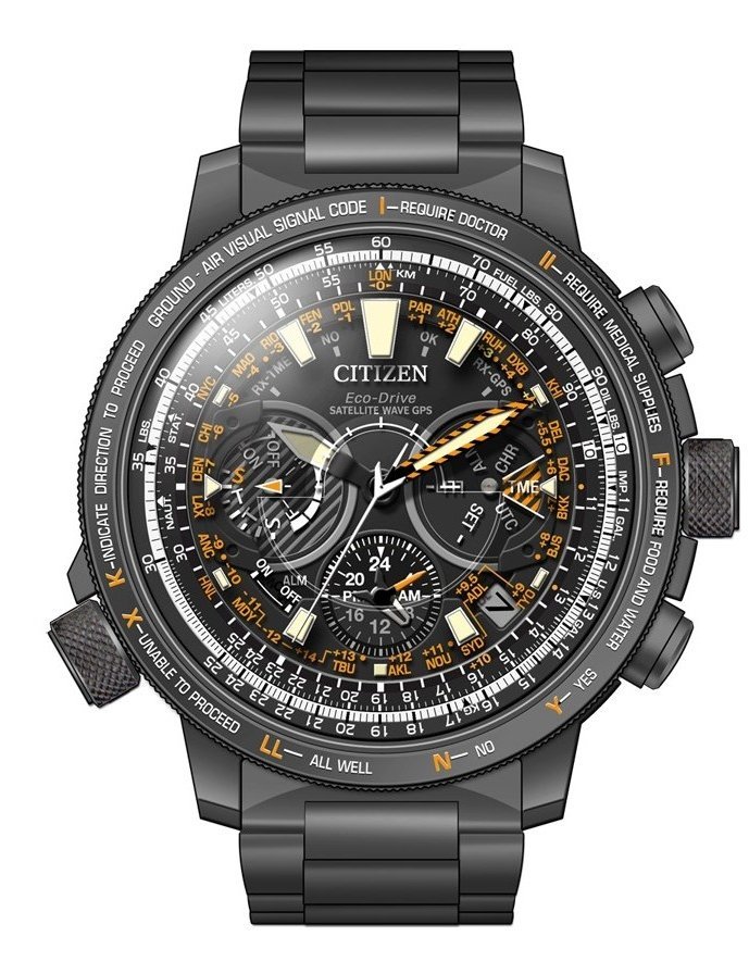 Features high-end light-powered Eco-Drive movement with SATELLITE WAVE GPS Cal. F990. - Twice the spinning speed of hour and minute hands for HOME time corrections (compared to previous model) - High-speed twin-coil motor reduces the time required for hand movements forward or reverse (equivalent to 360° moving of minute hand) in less than one second. - Receives a time signal from a GPS satellite in a minimum of 3 seconds - Corrects time and calendar by syncing with GPS satellites (for any 39 cities) - Shows the time in two different world time zones simultaneously, and it switches home time and local time in one instant step. - 1/1 second chronograph measures 24 hours. - Light-Level Indicator*4 detects and displays the intensity of light striking the dial in seven sensitivity levels. - Features aviation scale and design using ground-air visual signal codes*5 to enhance the characteristics as a professional pilot watch.