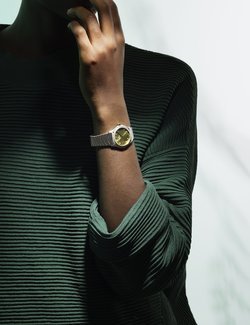 Ebel Sport Classic Lady & Mini Green watches feature a lustrous, velvety green dial embellished with eight diamonds and gold-plated hour, minute, and second hands. The delicate cocktail watch Ebel Sport Classic Mini features a dial made of striking, wild green galvanic. Both models are fitted with a bracelet in brushed stainless steel with polished gold iconic waves and an Ebel folding clasp.