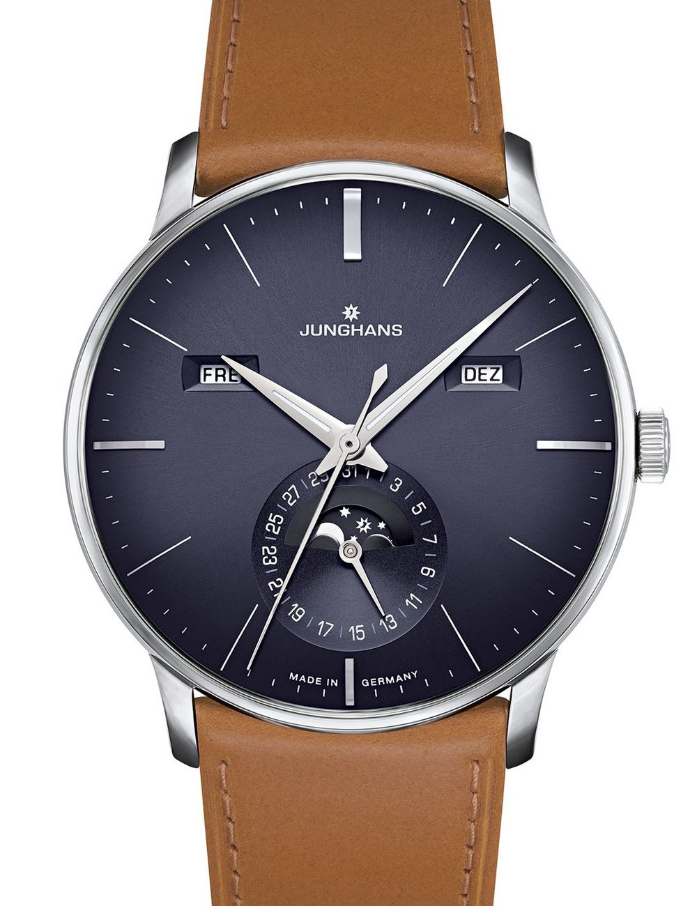 A Junghans classic, the Meister Kalender showcases Italian elegance in 2019. The harmonious combination of the leather strap in cognac and a dark blue dial is one of the most popular colour combinations in the Meister range. As well as exuding elegance, this exhibits a particular sense of style.