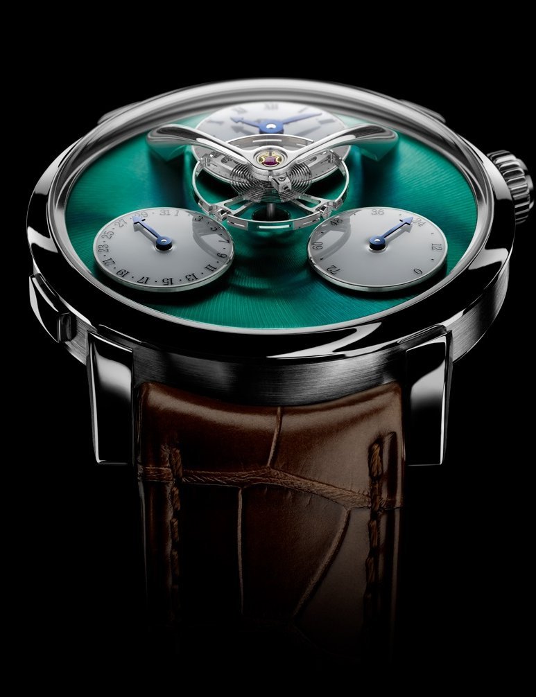 The LM Split Escapement was first launched in 2017 in four white gold “frosted” editions, each limited to 18 pieces. In 2019, MB&F introduces a new limited edition of 33 pieces in grade 5 titanium, with a spectacular green CVD-treated dial. The sun-ray dial finish catches the light from alternating angles, constantly changing between blue and green hues – adding a more contemporary edition to the series.