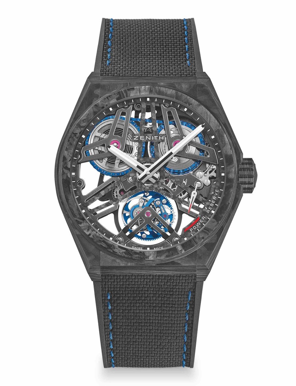 The first version features a light yet robust carbon case, crown and buckle head. The carbon fibre treatment even extends to the open dial, with the central skeletal element and surrounding flange ring giving off the unique shimmer of this material. To complete the high-tech look, the Defy Fusee Tourbillon in carbon is fitted on a black rubber strap with a “Cordura” fabric effect and blue stitching. A second strap is also supplied, in black rubber with a woven carbon effect. The Defy Fusee Tourbillon in carbon is limited to 50 pieces.