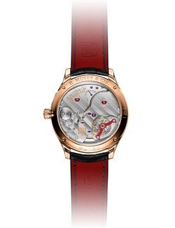 Hours and minutes. Central seconds hand with hacking seconds. AM/PM indicator – indices 12 to 6 o’clock representing AM and 7 to 11 o'clock representing PM. Very large moon phase display window. Power reserve indicator on movement side. Moon phase adjuster push-button on the case flank.
