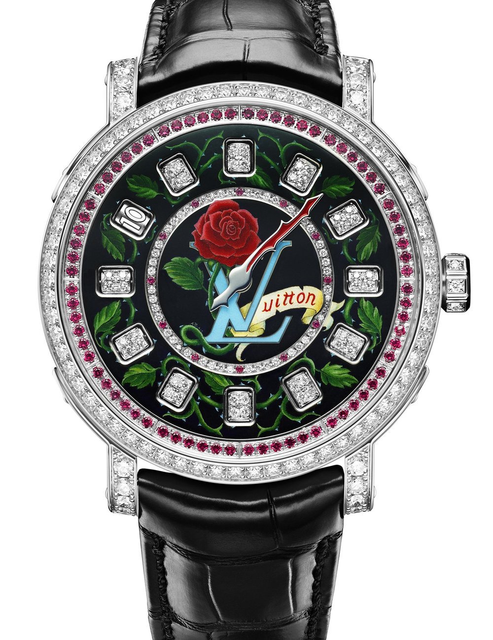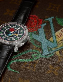 and is fitted with an 18-carat white gold ardillon buckle set with diamonds. The creation is presented in a custom Monogram canvas watch case