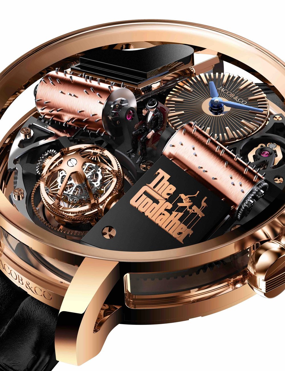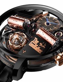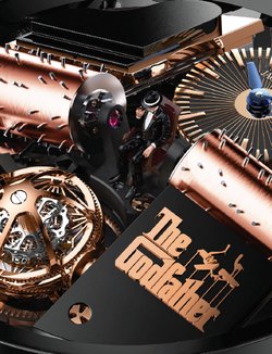Subsidiary hour and minute dial Triple-axis gravitational tourbillon (97 components; 1.79g): • 1st Axis Flying: in 24 seconds • 2nd Axis Flying: in 8 seconds • 3rd Axis Flying: in 30 seconds Godfather Melody activated by pusher at 2 o’clock: rotation of two cylinders against 2 combs (36 teeth in total) playing a melody of 120 notes, decorated by Black PVD and 18K Rose Gold Godfather plate, black lacquered piano and Miniature Godfather at the center of the movement; Movement rotation of 120° in 30 seconds