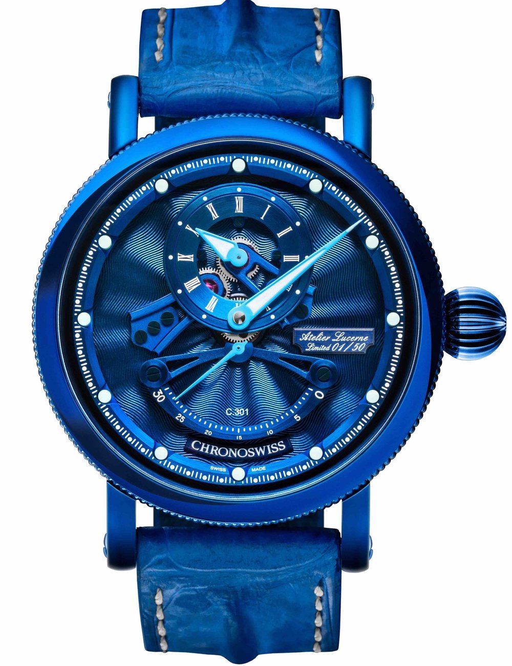 Regardless of the intriguing play of colors, which make each variant something special, it impresses with its high level of sheer craftsmanship: the dial surface is elaborately hand-guillochéd for each individual timepiece in the series. This is administered with much love and skill on a historic rose-engine in the workshops of the House of Chronoswiss, Lucerne, thus creating an exceptional fusion of innovative design and traditional craftsmanship.