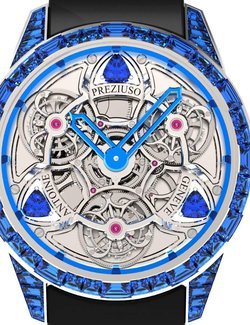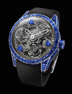 This unique watch in 18 ct white gold contains 233 saphirs of over 24 ct in total, in rare blue royal, baguette-cut, invisible mounting, with three solitary trillion saphirs floating on the dial, beside the three tourbillons.