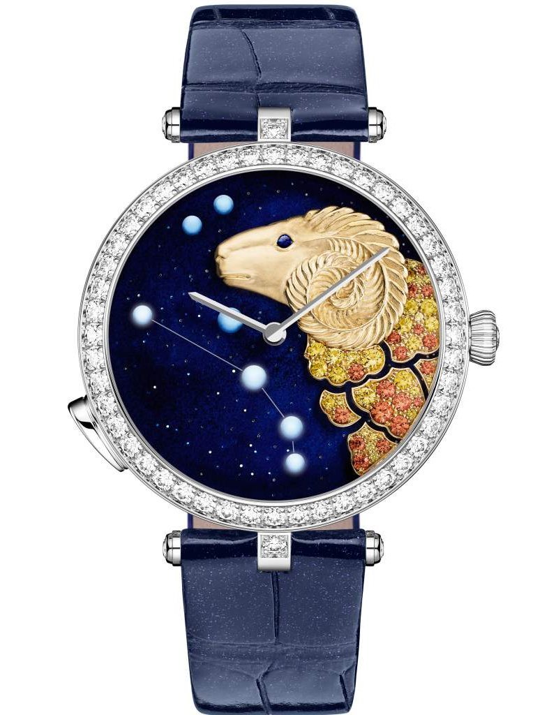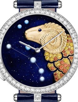An invitation to live life to the rhythm of the cosmos, the twelve women’s Lady Arpels Zodiac Lumineux models recreate the twinkling of the stars through an exclusive on demand lightning model. Delicately sculpted and gem-set, the signs of the Zodiac contrast with a glitter blue enamel background, echoing the celestial sky.