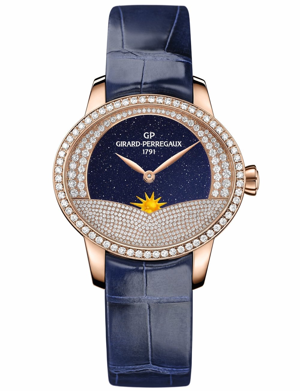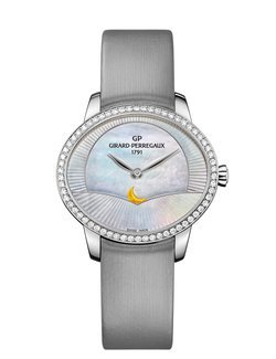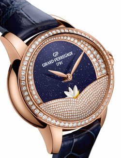 The case of the Cat’s Eye provides an ideal setting for these two specifically chosen flowers. With its oval shape and pleasingly balanced proportions, it gracefully embraces the shape of the wrist, as do the curved lugs and domed crystal.