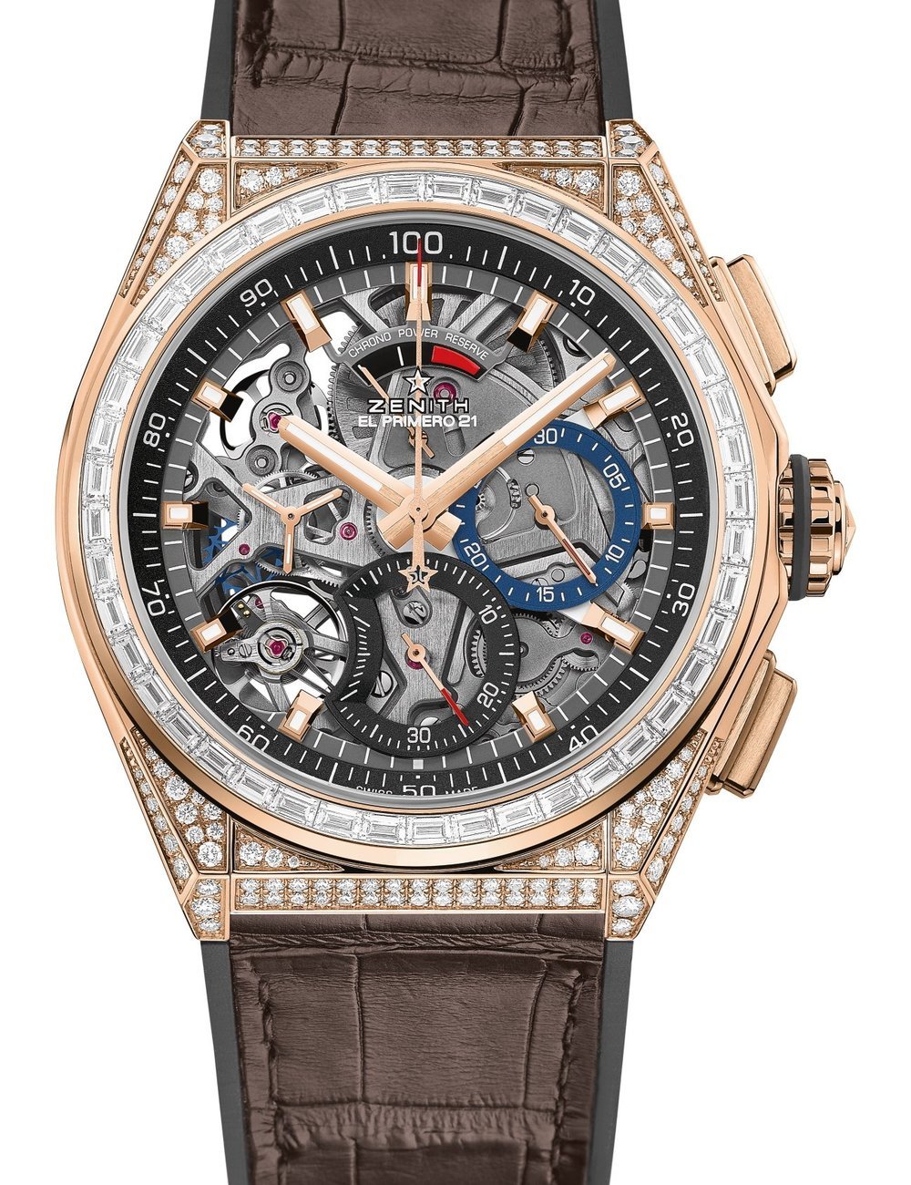 Already a statement piece with its unrivalled 100th of a second chronograph movement and resolutely contemporary looks, the Defy El Primero 21 High Jewelry pushes boundaries even further. With a rose gold case entirely set with brilliant cut white diamonds and the bezel with baguette cut diamonds, this rendition of the Defy El Primero 21 turns the exceptional into outstanding.
