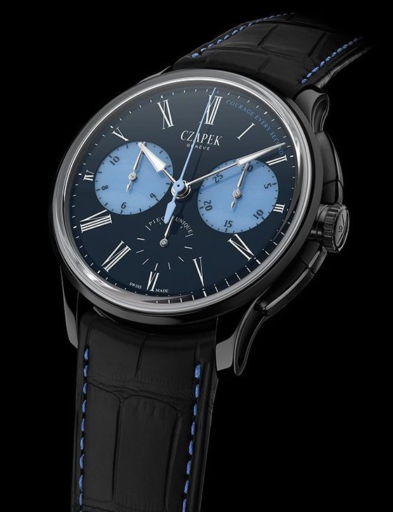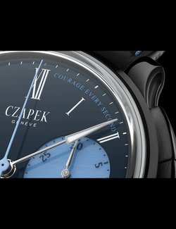 Based on Czapek’s COSC-certified, 5 Hz, integrated chronograph Faubourg de Cracovie, the Only Watch unique piece features a 5-grade titanium case with ADLC® coating and a magnificent black onyx dial that is beautifully offset by light blue chalcedony counters - a reference to the official colour of Only Watch 8th edition.
