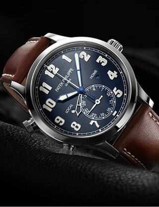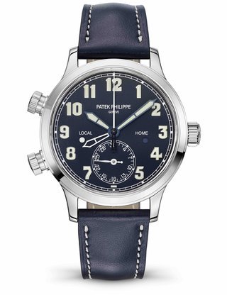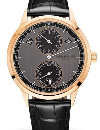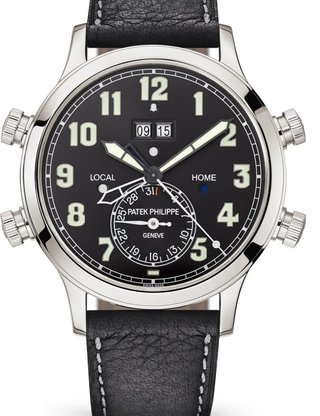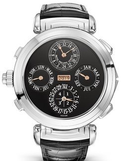 Second time zone. Second time zone day/night indicator. Day, date (on both dials), month, leap-year cycle by hands. Four-digit year display in an aperture. 24-hour and minute subdial. Crown position indication (R,A,H).