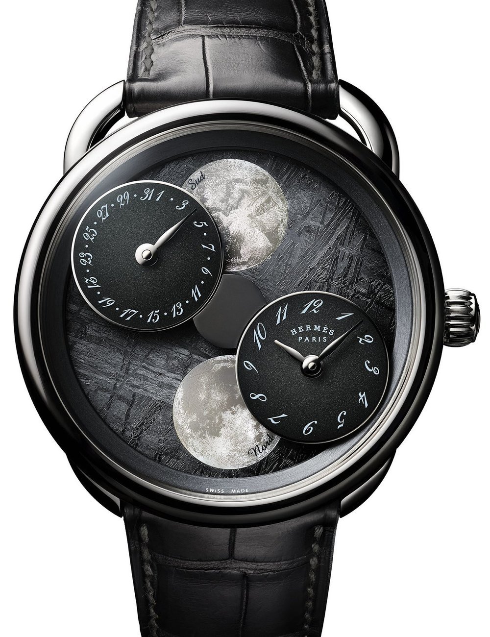 Dial: meteorite, blue rhodium-plated - Moons in white natural mother-of-pearl Southern moon: Pegasus transfer inspired by the Pleine Lune motif designed by Dimitri Rybaltchenko Northern moon: lunar surface transfer - Rhodium-plated hands