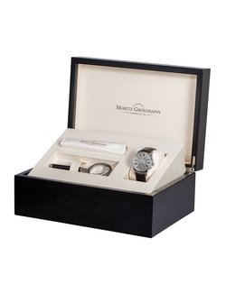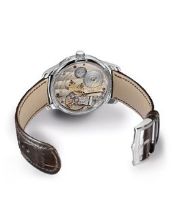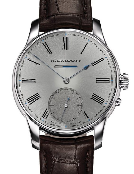 Hours and minutes, subsidiary seconds with stop second, Grossmann manual winder with pusher, power-reserve indicator. Frequency: 18,000 semi-oscillations per hour. Power reserve 42 hours when fully wound.