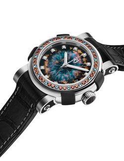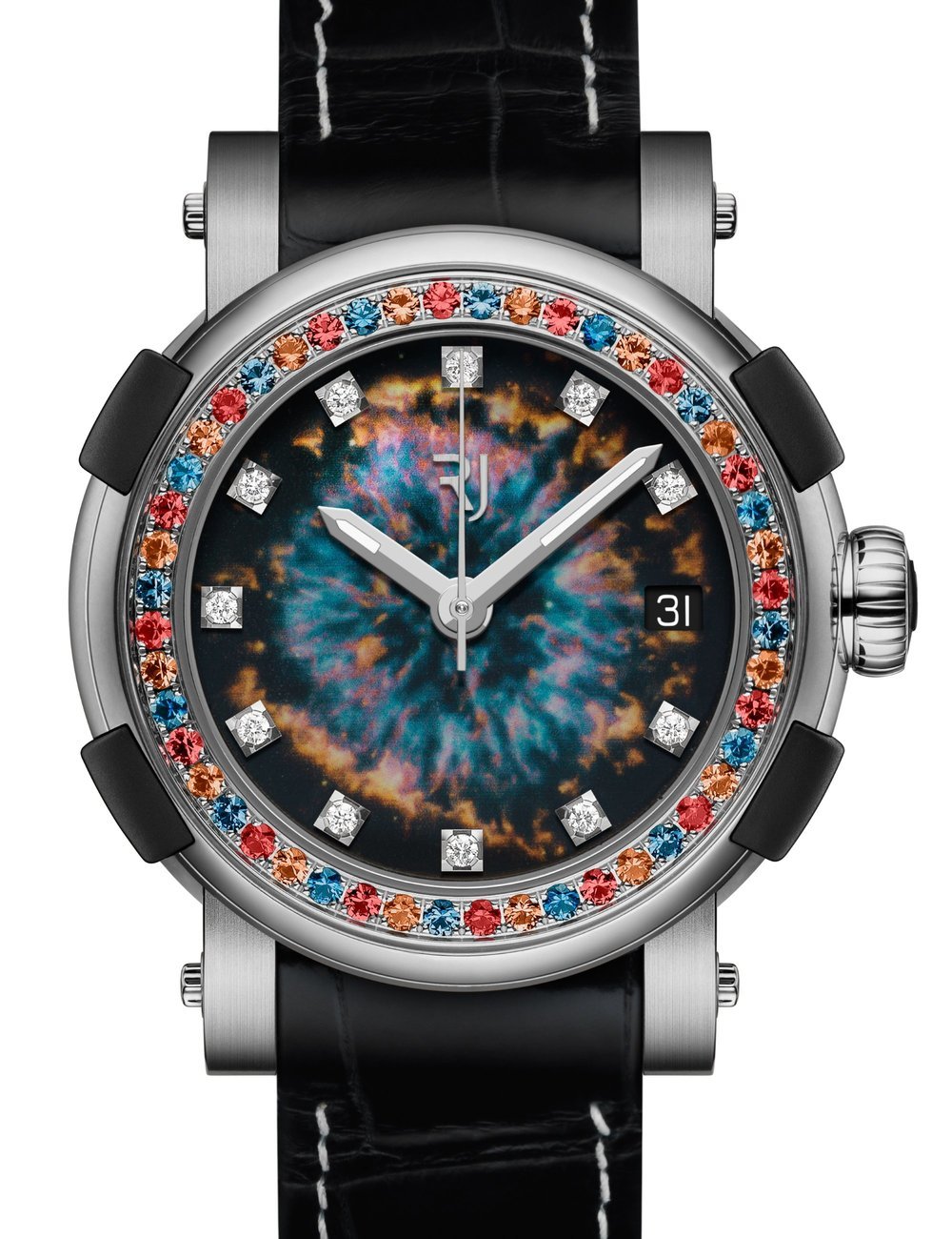 The new Star Twist collection is the brand’s first ladies’ collection. In a world first, RJ has rendered a deep space object in four layers of paint and a fifth layer of transparent coating over mother-of-pearl, giving it a shiny effect and reflecting the immensity and color range of the endless universe and ever moving galaxies. 11 diamonds as indexes add a sparkling touch. The mesmerizing dial displays central hours, minutes and seconds, as well as a date aperture at 3 o’clock.