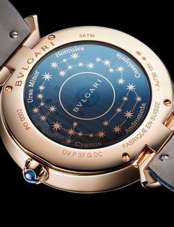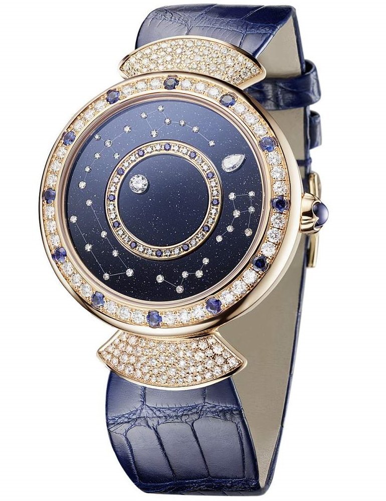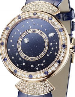 The Divas’ Dream collection welcomes a poetic “The Roman Night” model. The timepiece indicates the hours and minutes on two overlaid Aventurine discs, each set with a diamond pointing to the hours and minutes shown by sapphires serving as hour-markers and minute-track, alternating with brilliant-cut diamonds.