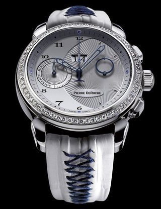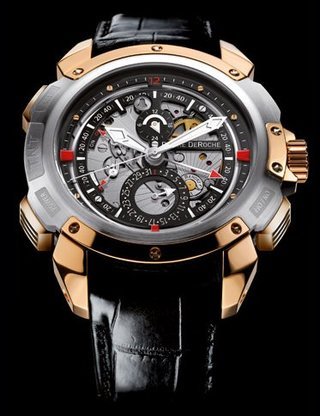 Mechanical automatic, exclusive Dubois Dépraz calibre, 58 jewels. 6 retrograde second hands on gears, strip-spring return. Decorative oscillating weigh, “Côtes de Genève” date platform, chamfered bridges.