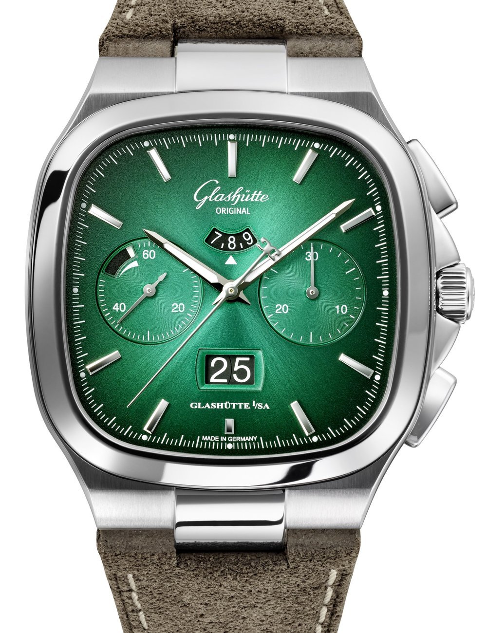 The Seventies Chronograph Panorama Date from Glashütte Original continues to enjoy an enthusiastic reception five years it was first presented. And today the successful chronograph presents another facet, in two limited editions of 100 pieces each: equipped with dials in green and grey, the new versions pay special tribute to the landscape that has inspired the work of Glashütte’s watchmakers for over 170 years.