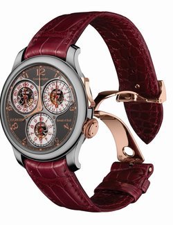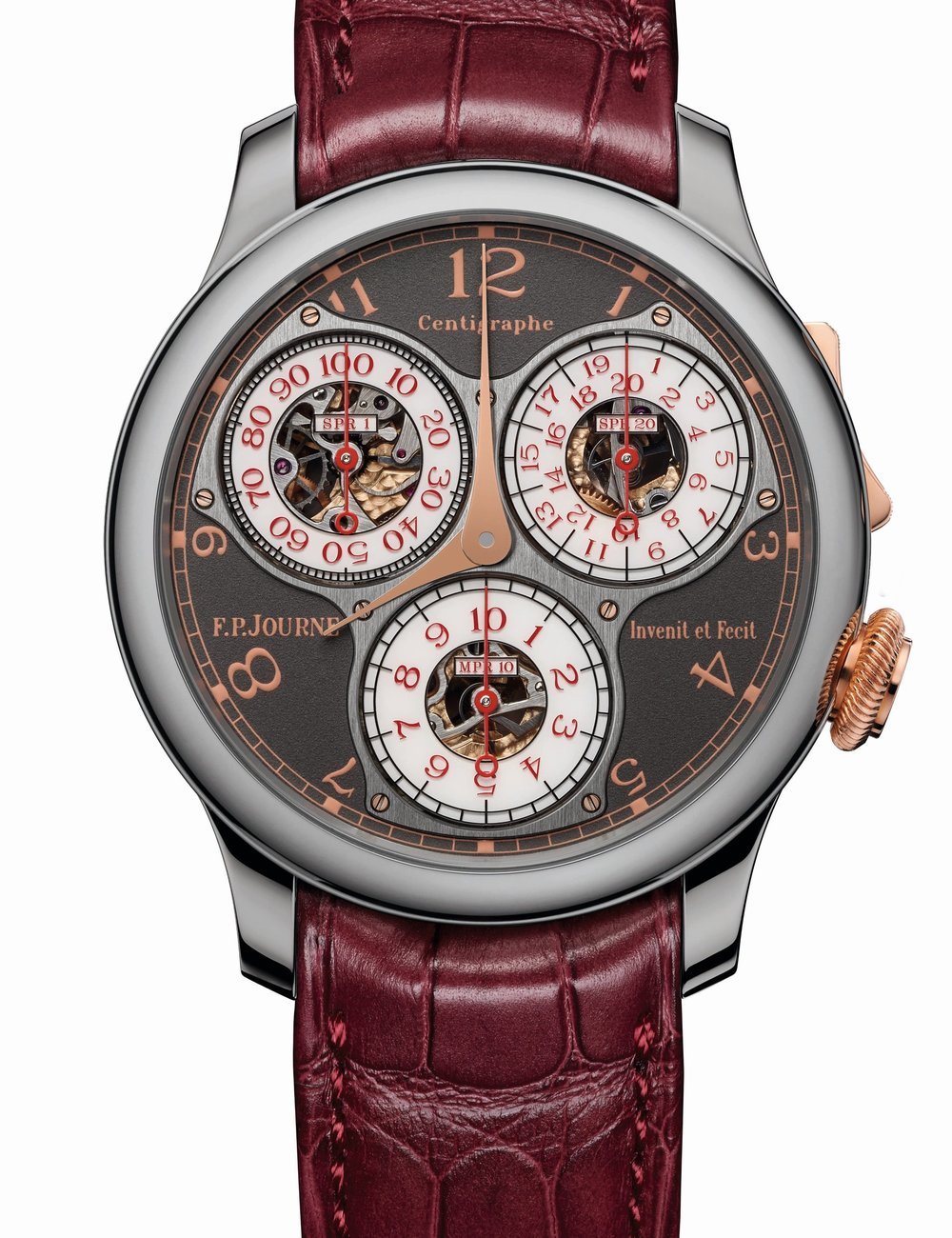 The Centigraphe Souverain Anniversaire is the only watch in the F.P.Journe’s Classique collection to use a polished Titanium case. The 40mm case is accented by a crown, patented chronograph rocker switch and deployant buckle in 18K 6N Gold. Further distinguishing the Centigraphe Souverain Anniversaire from the now discontinued Centigraphe Souverain is the dial, now in Ruthenium with Gold printing and sapphire subdials with open centers, exposing the solid 18K rose Gold movement.
