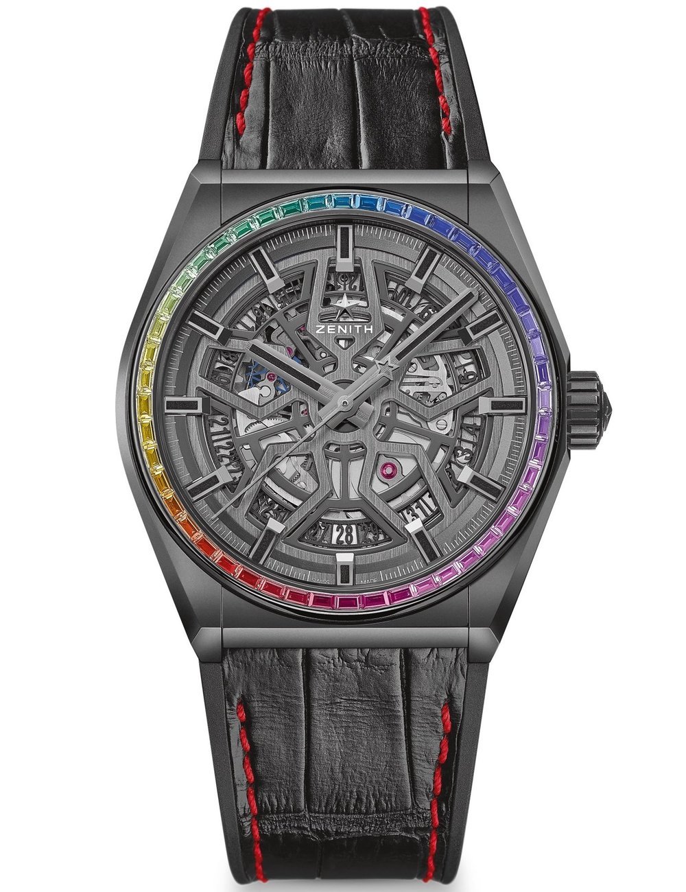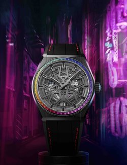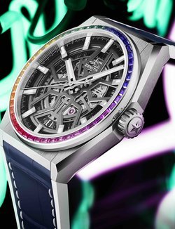 While the Zenith Defy Classic can be considered the purest expression of Zenith’s avant-garde vision, the Rainbow edition is far from classical. Made for those with a strong sense of style and no fear of self-expression, the bedazzling boutique and region-exclusive series adds a vibrant punch to the neo-futuristic look. The open dial with a central star motif creates a sense of harmonic visual depth against a contemporary architectural backdrop. In the Midnight Black Ceramic version, the hands, markers and raised flange ring are totally blacked out with touches of black Super-LumiNova®, while the Titanium version features rhodium markers and hands filled with white luminescent pigments atop a black flange ring. The yin and yang contrast between the two versions is amplified by the colourful gleam of the sapphires on the bezel.