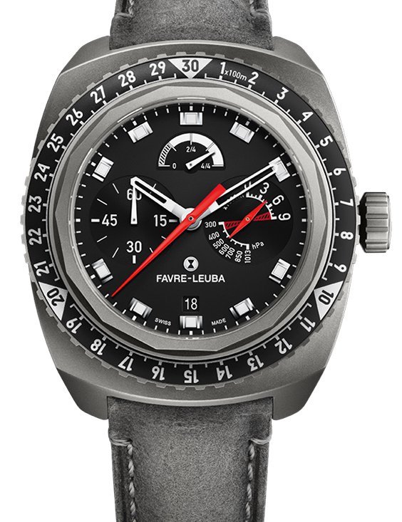 Hours, minutes, small seconds, central hand to display altitudes of 3,000 m per full rotation, subdial for displaying altitudes of up to 9,000 m and air pressure in hPa, power-reserve indicator, date display