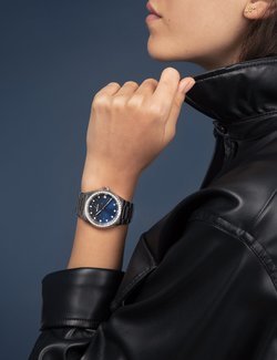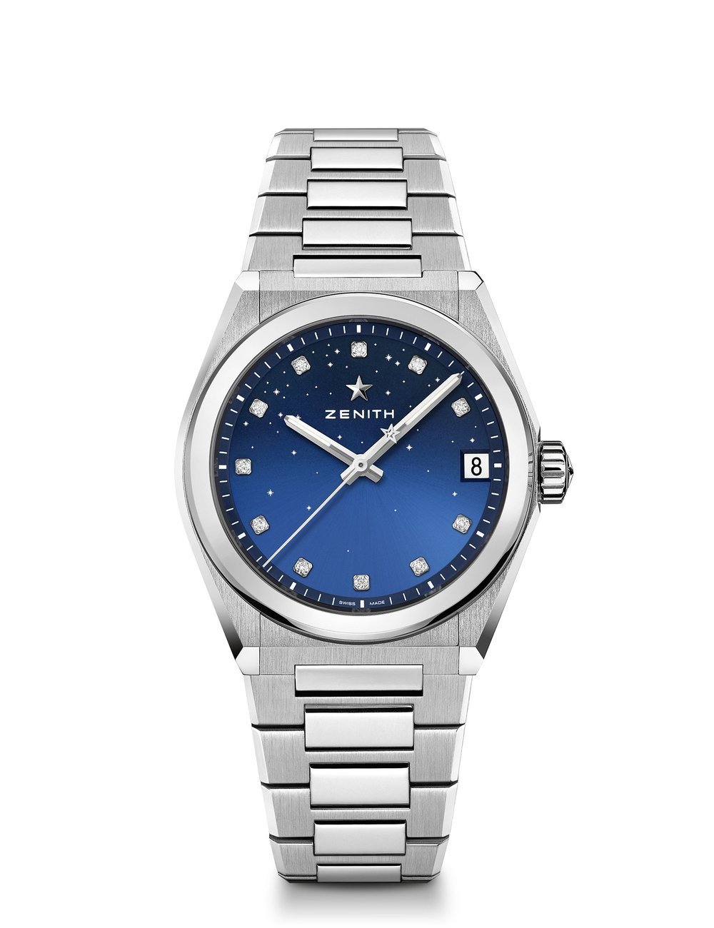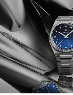 Available in deep blue or grey colors, the dial features a glossy finish with a vertical gradient effect for an unprecedented depth. Portraying the night sky above the endless horizon, where the dark vastness of space gives way to the glimmer of starlight, the dial at once enchants and enlightens the wearer. Evoking the Zenith starry sky, the brand’s faceted star emblem is the highest, brightest point in the depicted night sky. Completing the celestial landscape are stars of different sizes – some of which glow in the dark. A third dial made of white mother-pearl with a vertical gradient effect evokes moonlight on a cloudy night.