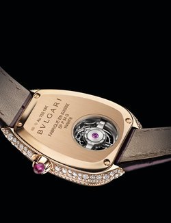Designed to fit the Serpenti-shaped case, this small-sized shaped Haute Horlogerie movement is rhodium-plated, hand-decorated with Côtes de Genève, perlage and beveling, and features one sapphire bridge. Unlike other watchmakers, Bulgari adapts the technical considerations to suit the aesthetics, and thus chose a transparent sapphire backcase at the level of the tourbillon to highlight the movement and decoration work, a winding stem inclined of 6 degrees, located between 2h and 3h, and special pavé setting to achieve as thin a case as possible.