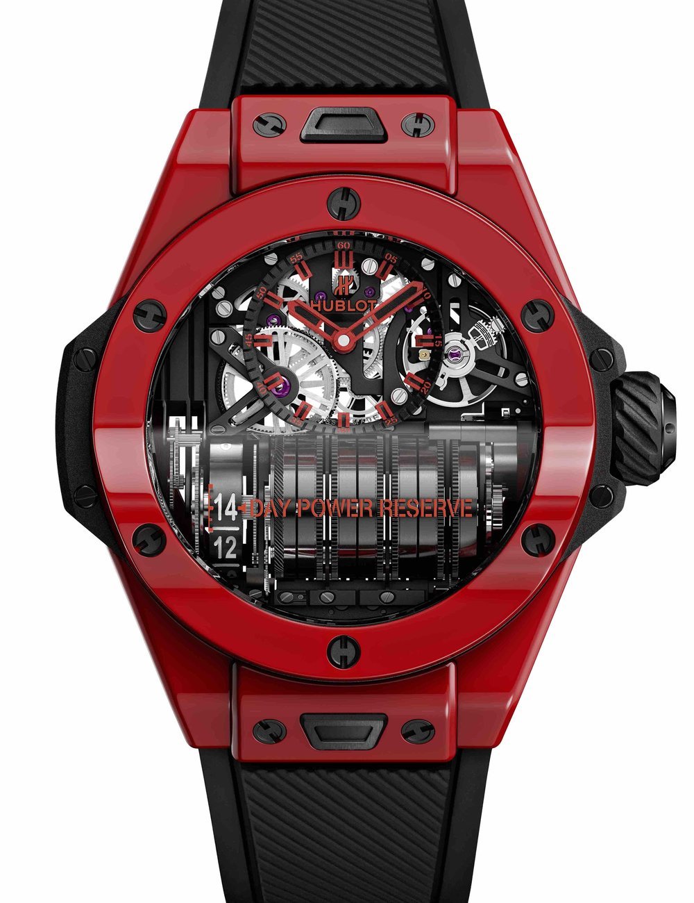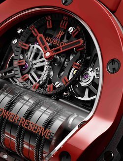 This new Red Magic Big Bang reinvents horological performance, with a manufacture movement offering an unparalleled power reserve of 14 days via seven barrels which are visible from the dial side.