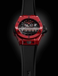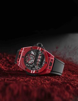 Effortlessly embodying the Art of Fusion, this state-of-the-art red ceramic is paired with a Hublot manufacture movement offering unrivalled performance and design. Featuring an innovative and spectacular construction which can be admired through the transparent dial, the Hublot calibre HUB9011 manual-winding skeletonised movement offers an exceptional power reserve of two weeks via seven series-coupled barrels. To enable energy to be transmitted between the horizontal barrel arbor and the vertical gears controlling the hour and minute display, the designers made use of a system rarely employed in watchmaking: a 90-degree helical worm gear. To create an aesthetic balance with this helical gear, which is visible at 10 o’clock, the balance, made from anthracite ruthenium, was moved to the dial side in a symmetrical position at 2 o’clock.