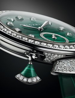 In the latest models of the Divas’ Dream collection, the Roman jeweler continues to push the limits of form and function. Bringing the jeweler’s touch to the grand tradition of complicated watchmaking, the new Divas’ Dream Minute Repeater Malachite dares to combine one of Bvlgari’s most recognized motifs — the Diva fan-shape — with an extraordinary mechanical movement to create the thinnest ladies’ minute repeater to date.