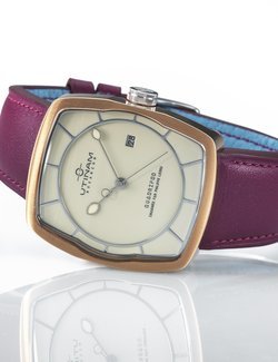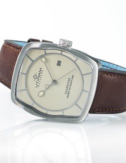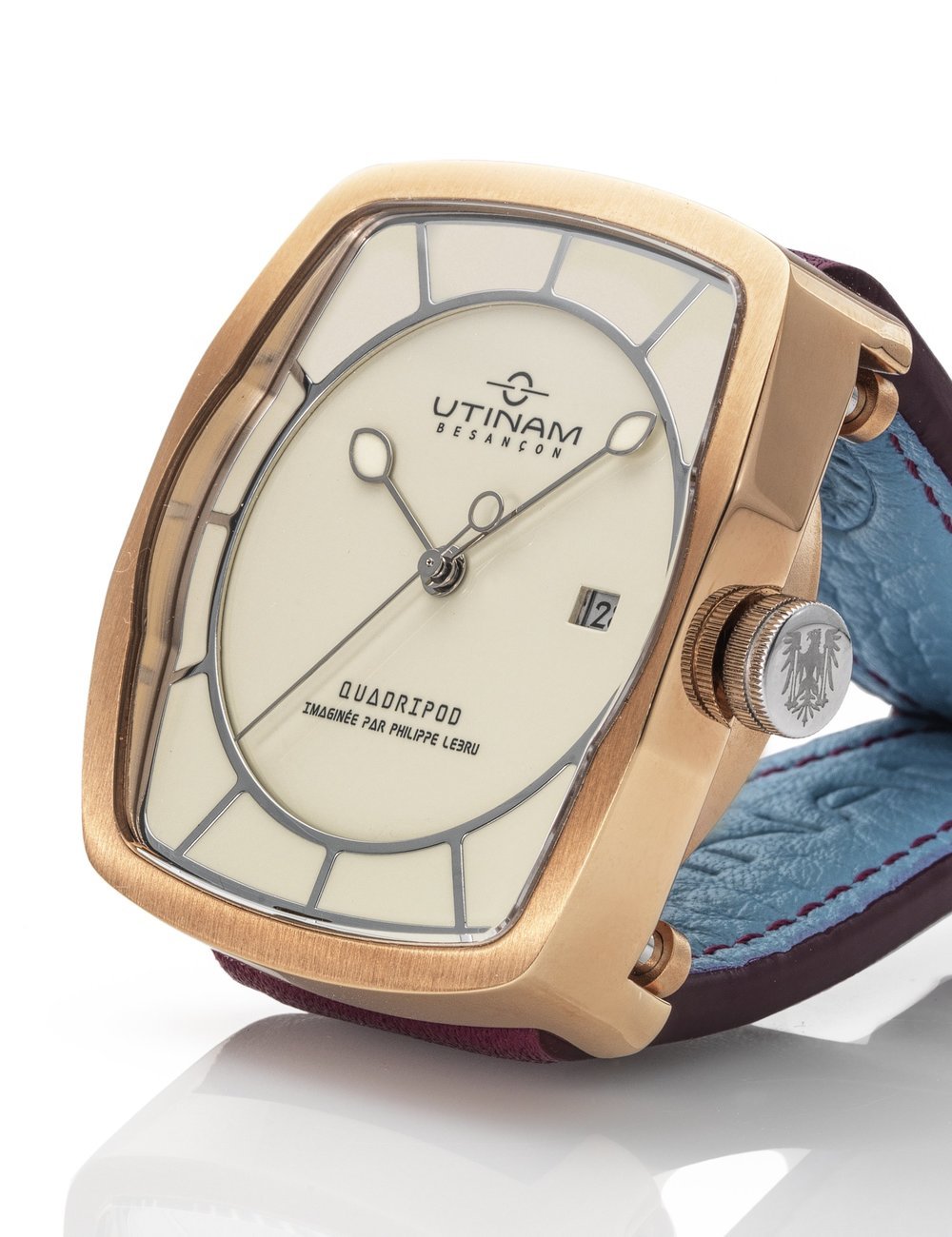 The form that should be neither round nor salient is a piece with a simple form and appearance, curved at 12 and 6 o’clock. The automatic mechanical movement is enclosed by four visible columns, that recalls four feet, which is the inspiration for the name of the collection «QUADRIPOD». The enamel strives to give under the light the depth of color in the ivory or midnight blue cartridges.