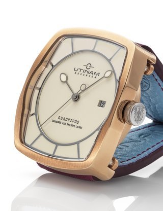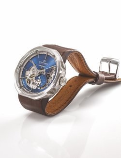 By using this manufacturing process, the colour of the metal can be left as it is and complex curves can be formed directly without subsequent re-work. The watch hands were made in a one-hundred-year-old factory based in Morteau ; and the strap, hand stitched in handsome brown leather, is the work of a Besancon based artisan.