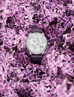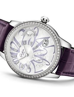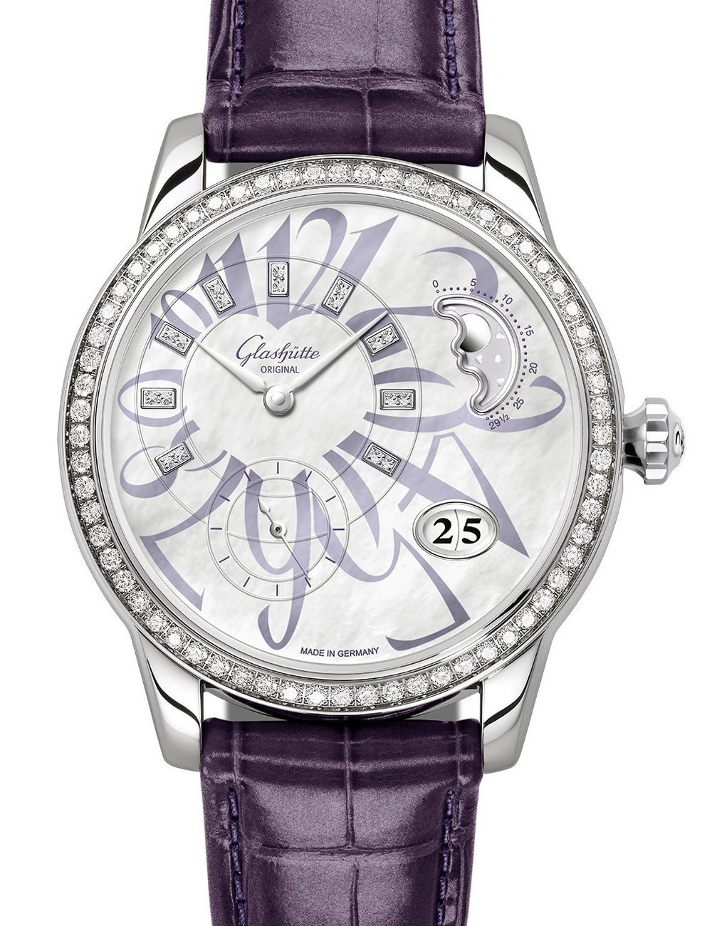 Glashütte Original adds another feminine masterpiece to the Lady Collection. The dial of the new ladies‘ watch is presented softly and playfully, with diamond-set rod indexes and lilac Arabic numerals forming a heart at the centre.