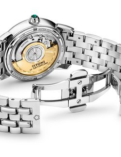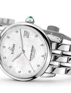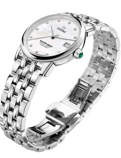 The mother-of-pearl dial of this fine watch comes with 12 full-cut, real diamonds. The hour and minute hands resemble the shape of a slender leaf. A further highlight of this timepiece is its crown. Designed with the curved forms of a plum flower in full bloom, the feminine crown carries a green stone like a pistil in the center, symbolizing the natural beauty of women.